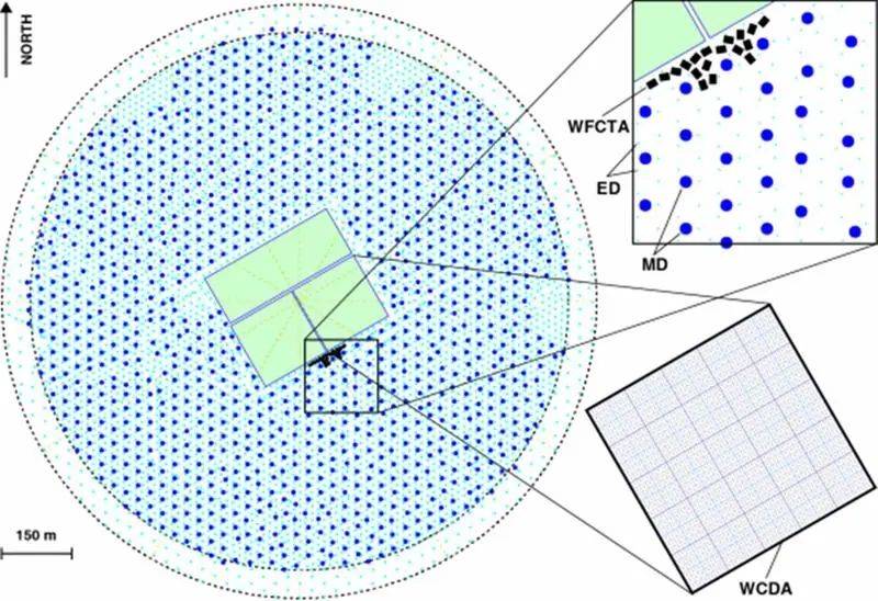 记者了解到,本次观测成果主要由“拉索”的水切伦科夫探测器阵列提供。该探测器利用36万吨的纯净水作为介质,通过水底放置的6240支不同尺寸的光敏探头,测量伽马射线或宇宙线在大气层中运动与作用过程的次级产物,如低能伽马光子、正负电子等,它们会在水中产生切伦科夫光信号。该阵列对伽马射线的观测能量范围跨域两个量级,在千亿电子伏特到十万亿电子伏特之间,且具有宽视场、全天候的特点,对伽马暴这样的突发天体现象的捕捉式观测具有突出的优势。
