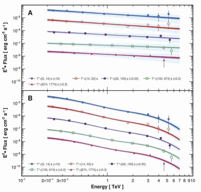 据介绍,“拉索”收集到的信号细节表明,探测到的光子来源于主爆之后的后随爆炸。伽马暴事件的“主爆”,也称为瞬时辐射,是初始阶段的巨大爆炸,表现为强烈的低能伽马射线辐射。接近于光速的爆炸物与周围环境气体碰撞则产生“后随爆炸”,也称为余辉。“‘拉索’首次精确地观测了‘后随爆炸’的完整过程,记录了万亿电子伏特伽马射线流量增强和衰减的整个阶段。”曹臻说。