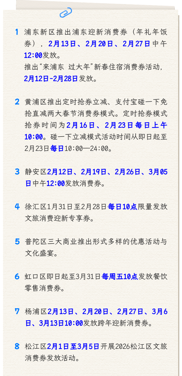 虹口区新闻办介绍,2月6日至3月31日虹口开展“乐购虹口·新春惠享”餐饮零售消费券发放活动,覆盖团圆宴、年货采购、线上购物等多元场景,助力居民乐享新春消费盛宴。本次活动覆盖2026年新春假期前后及节后焕新旺季,活动期间,