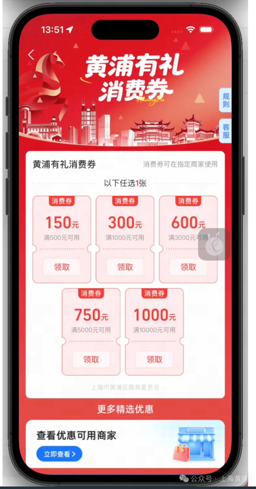 参与规则:定位在上海的消费者均可参与,单笔消费仅限使用1张,每期券自领取之日起7日内有效,过期自动失效。