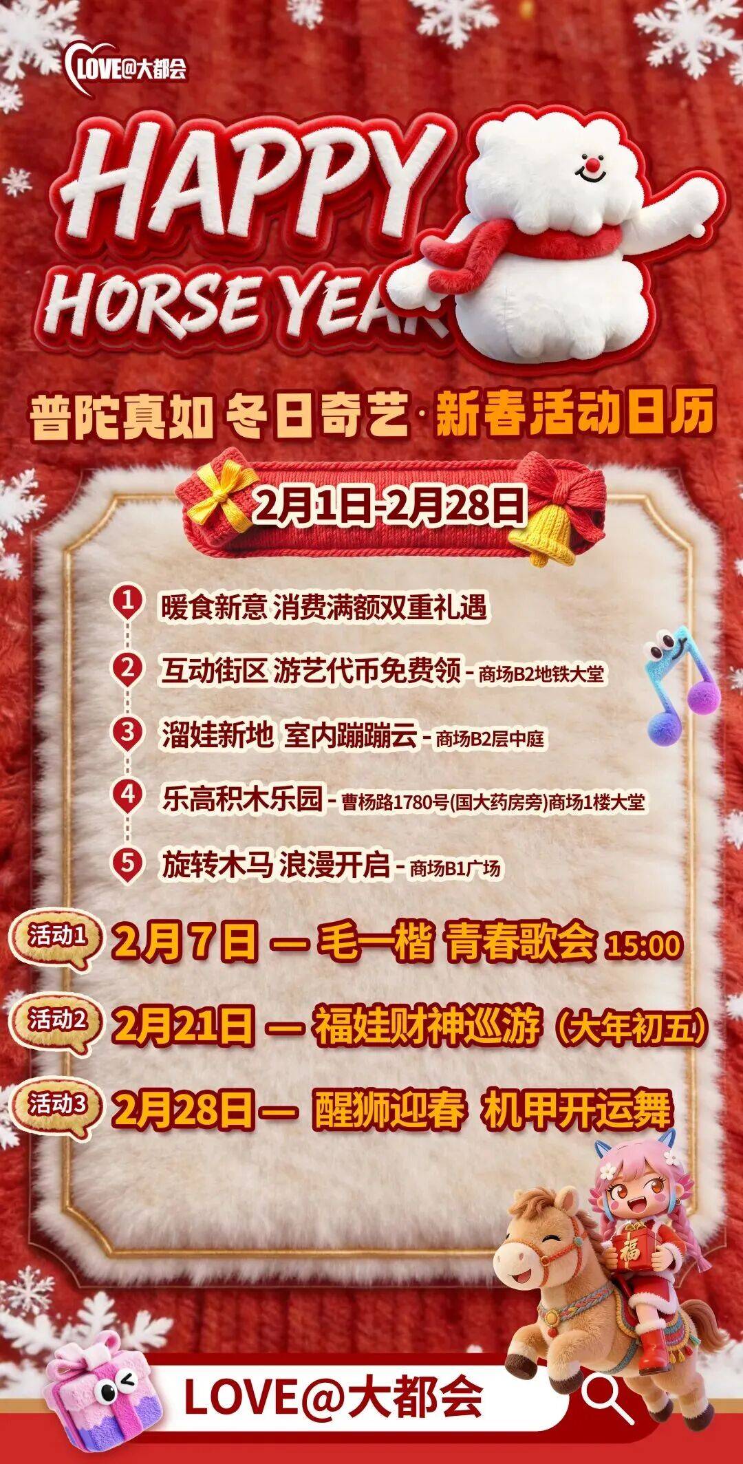 普陀区新闻办介绍,随着马年春节的脚步日益临近,普陀区真如商圈三大商业体纷纷亮出“绝活”,以“真如好事·跃马迎春”为主题,推出形式多样的优惠活动与文化盛宴,点燃市民消费热情,营造浓厚的节日氛围。